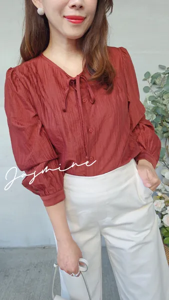 領綁肩抓摺排釦雪紡衣